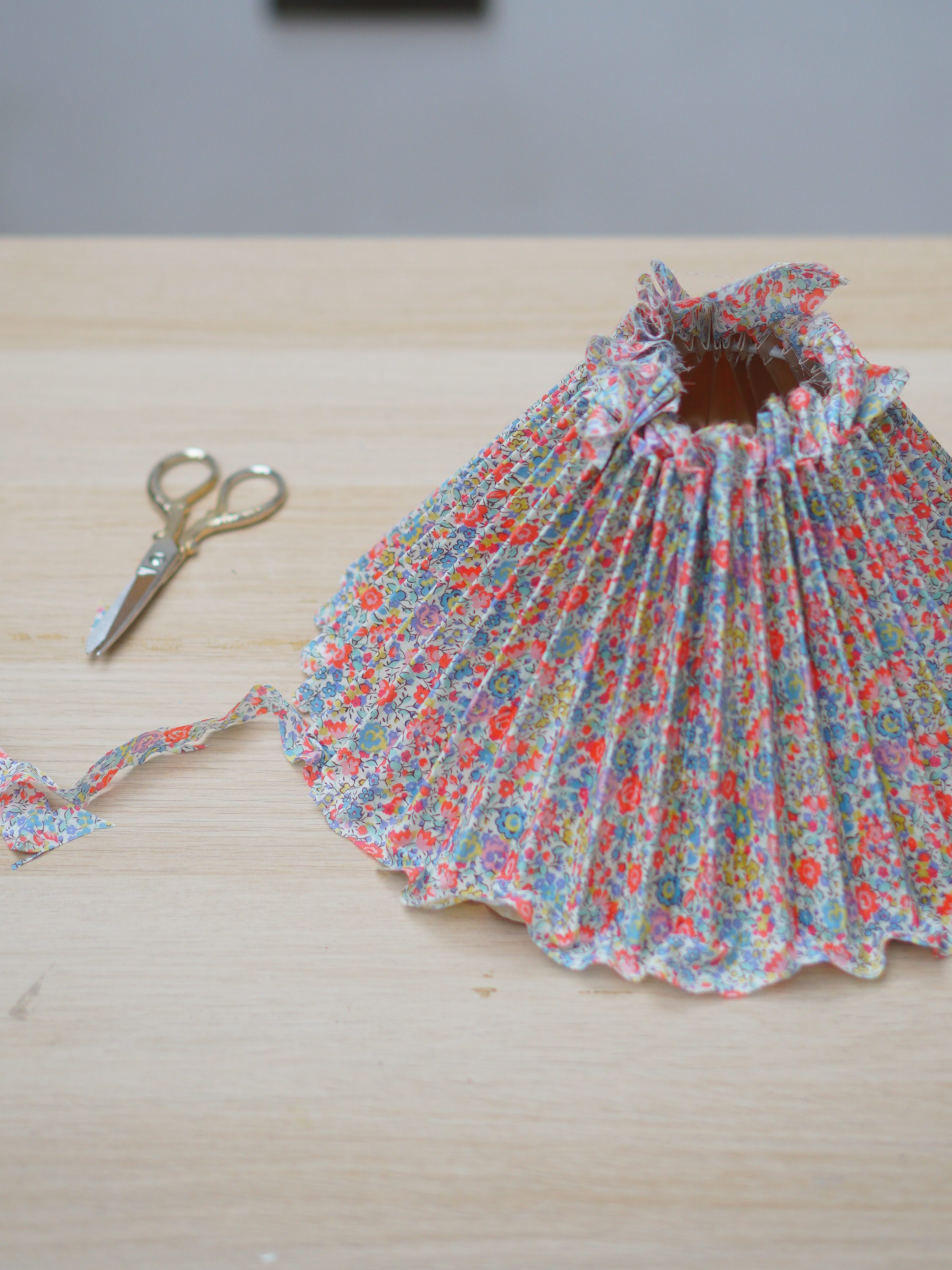 I carefully covered the top of the lampshade with the fabric, making sure it looked nice and smooth. Here’s how I did it using fabric glue: