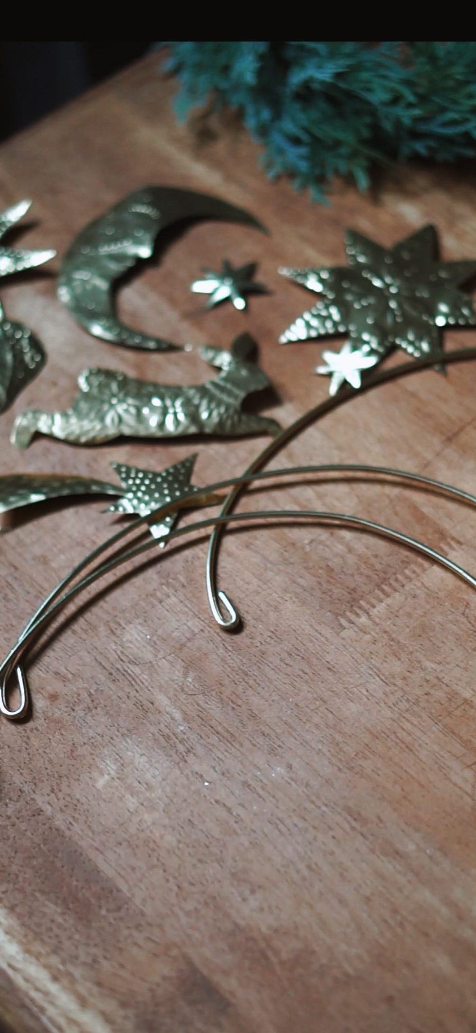 The frame was a bit of a puzzle. I used thin brass wire to create three cascading arches, which would hold the shapes at different levels. My goal was to make the mobile feel balanced but not too “perfect”—I love a bit of asymmetry for that handmade charm.
