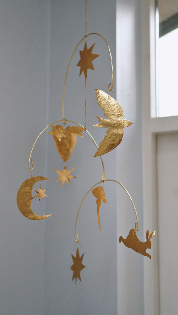 Find the perfect spot for your mobile—ideally near a window where it can catch natural light. The movement and glow of the embossed gold shapes will bring warmth and charm to any room. I hung mine near an archway in our new home, where the light hits it just right, making it feel magical.